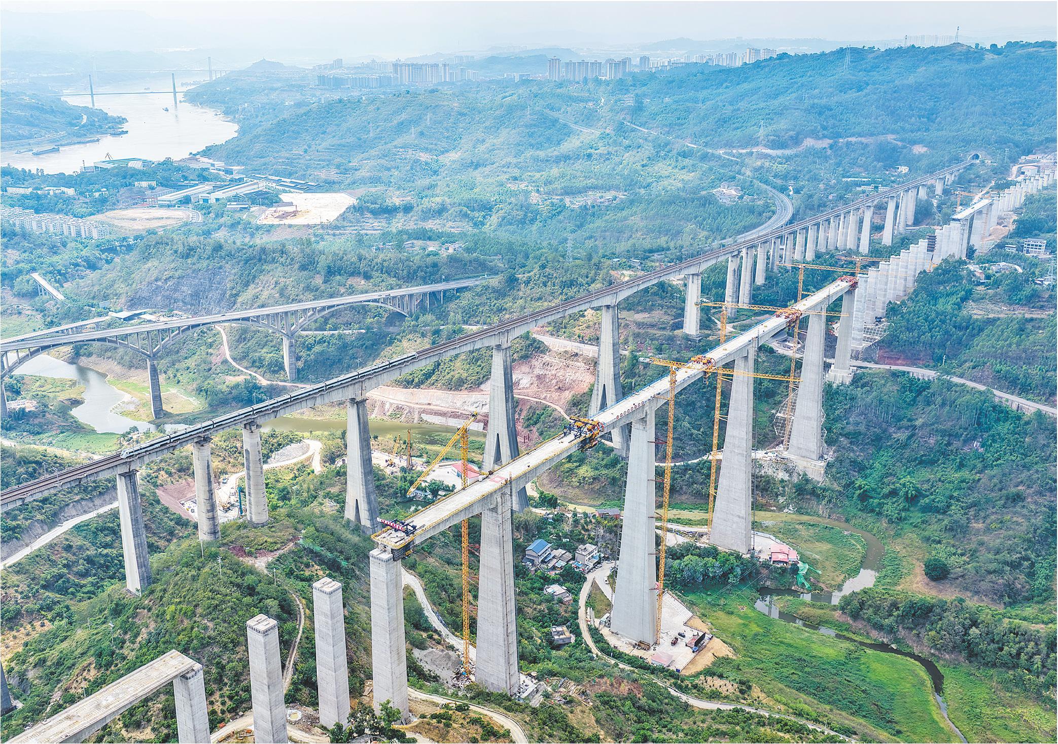 蔡家沟双线特大桥位于重庆市涪陵区,横跨长江支流,是全线重难点工程。大桥主跨采用连续刚构设计,整体呈“两端短、中间长”的对称结构,总跨度达584米。
