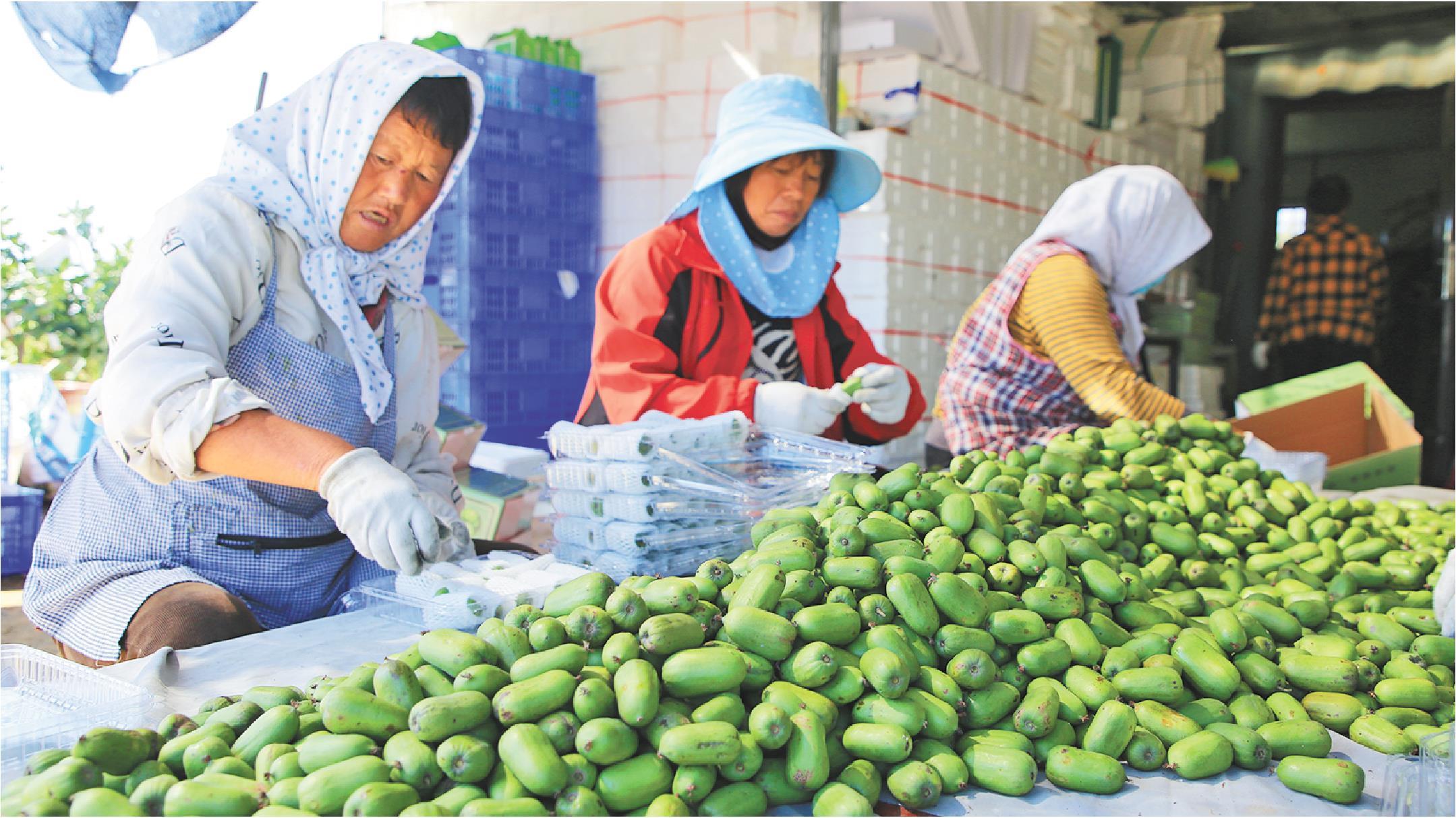 中辰农民专业合作社的百亩软枣猕猴桃采摘园位于日照市东港区后村镇西陈家沟村,2020年2月建成,亩产可达2000到2500斤,亩均收入超2万元。在合作社的带动下,周边村民也跟着种起了软枣猕猴桃。图为采摘工人正在包装分拣好的软枣猕猴桃。