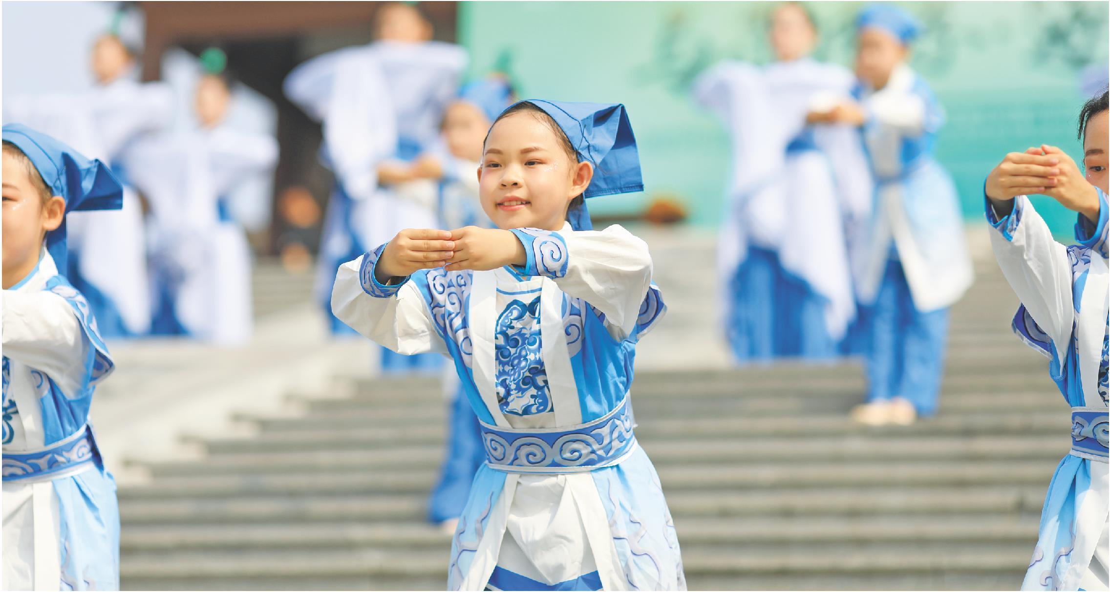 图为主仪式后上演的舞蹈《齐地巡礼》,展现了淄博市青少年的多才多艺和蓬勃朝气。