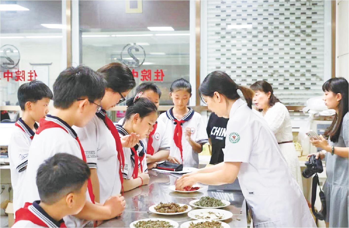 近日,菏泽市中医医院专家在教学生们认识香囊制作常用的中药材。