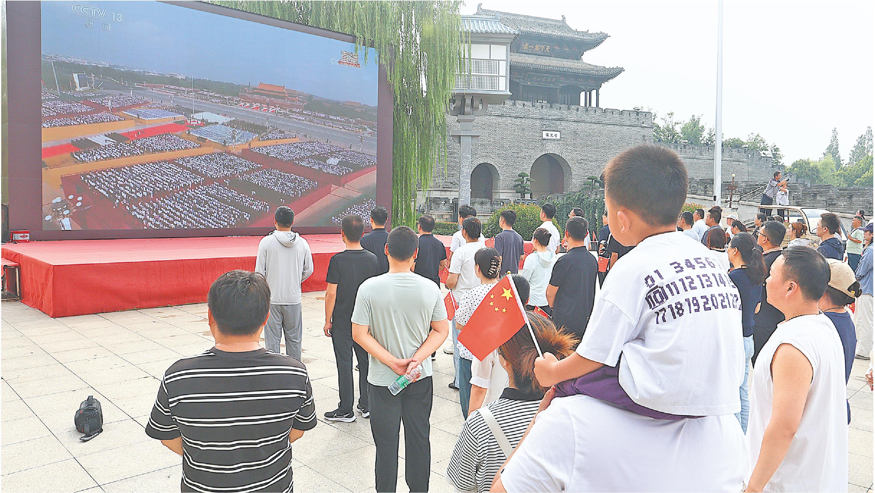9月3日,游客在枣庄市台儿庄古城西门观看纪念中国人民抗日战争暨世界反法西斯战争胜利80周年大会直播。(□新华社发)