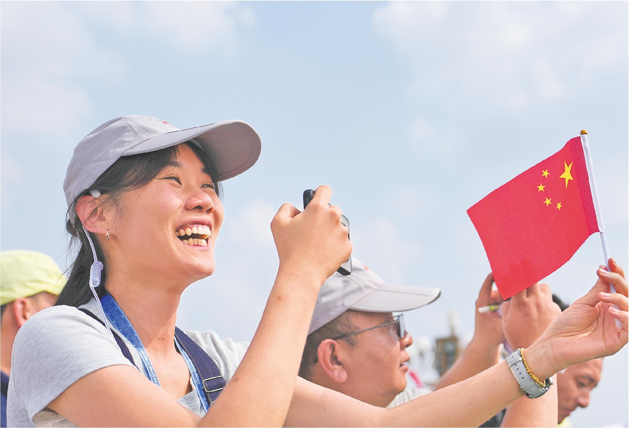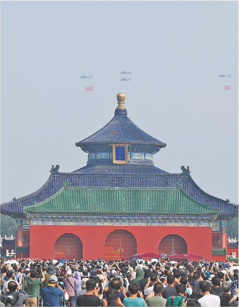 图②:市民在北京天坛公园观看空中护旗梯队。