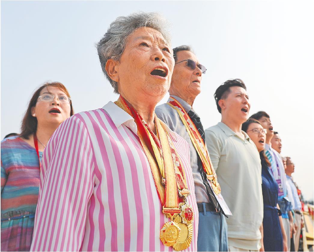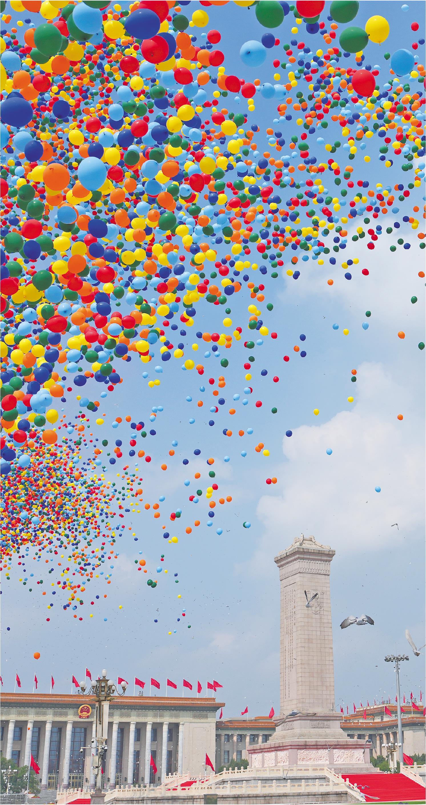 大会历时1小时26分钟,现场时而响起一阵阵掌声和欢呼声。随着8万羽和平鸽展翅高飞,8万只气球腾空而起,《歌唱祖国》的激昂乐曲响彻整个广场,广场内外汇成一片欢腾的海洋。