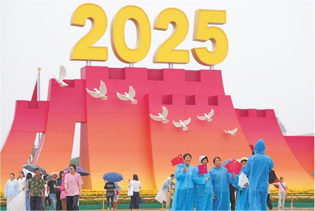 9月5日,市民游客在天安门广场上布置的年号台前合影。纪念中国人民抗日战争暨世界反法西斯战争胜利80周年大会圆满结束后,许多游客来到天安门广场的标志性景观前参观并拍照留念。