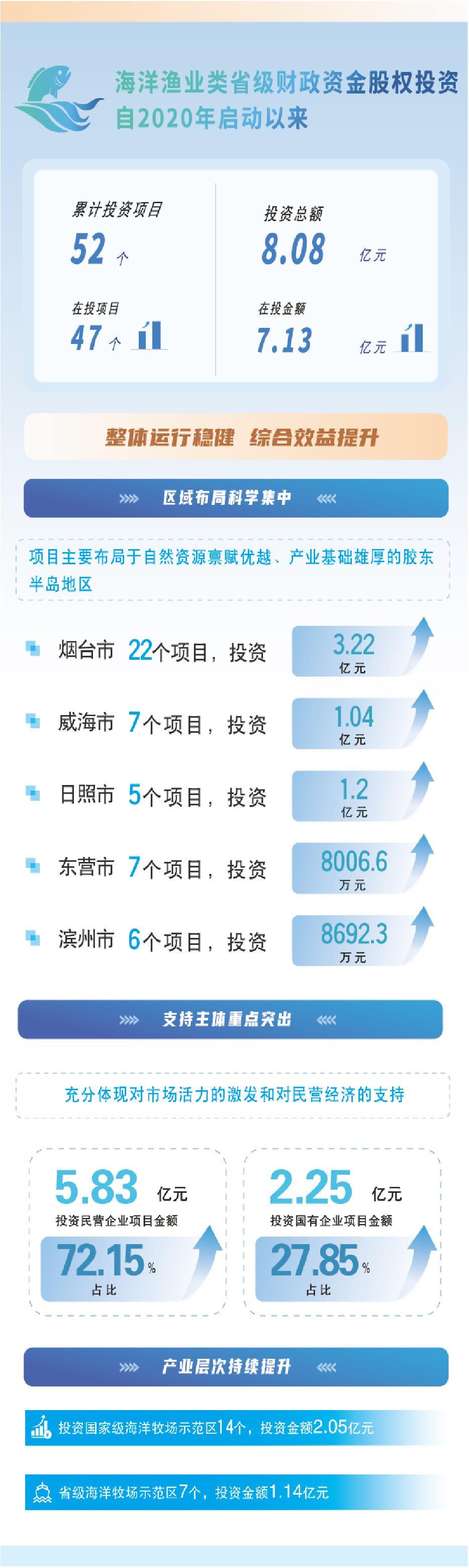 海洋渔业类省级财政资金股权投资自2020年启动以来,坚持聚焦产业、精准投放,累计投资项目52个,投资总额8.08亿元。其中,5个项目成功实现退出,47个项目在投,在投金额7.13亿元,呈现整体运行稳健、综合效益提升的良好局面。