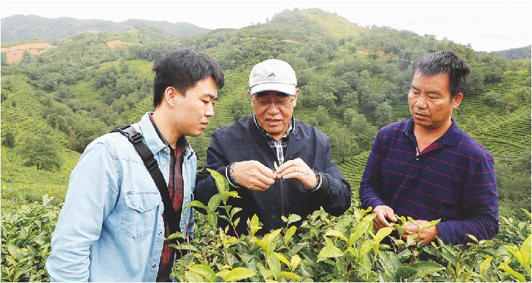首批全国高校黄大年式教师团队负责人汪东风教授(中)在云南绿春县指导茶农开展茶园管护。 摄影:王红梅