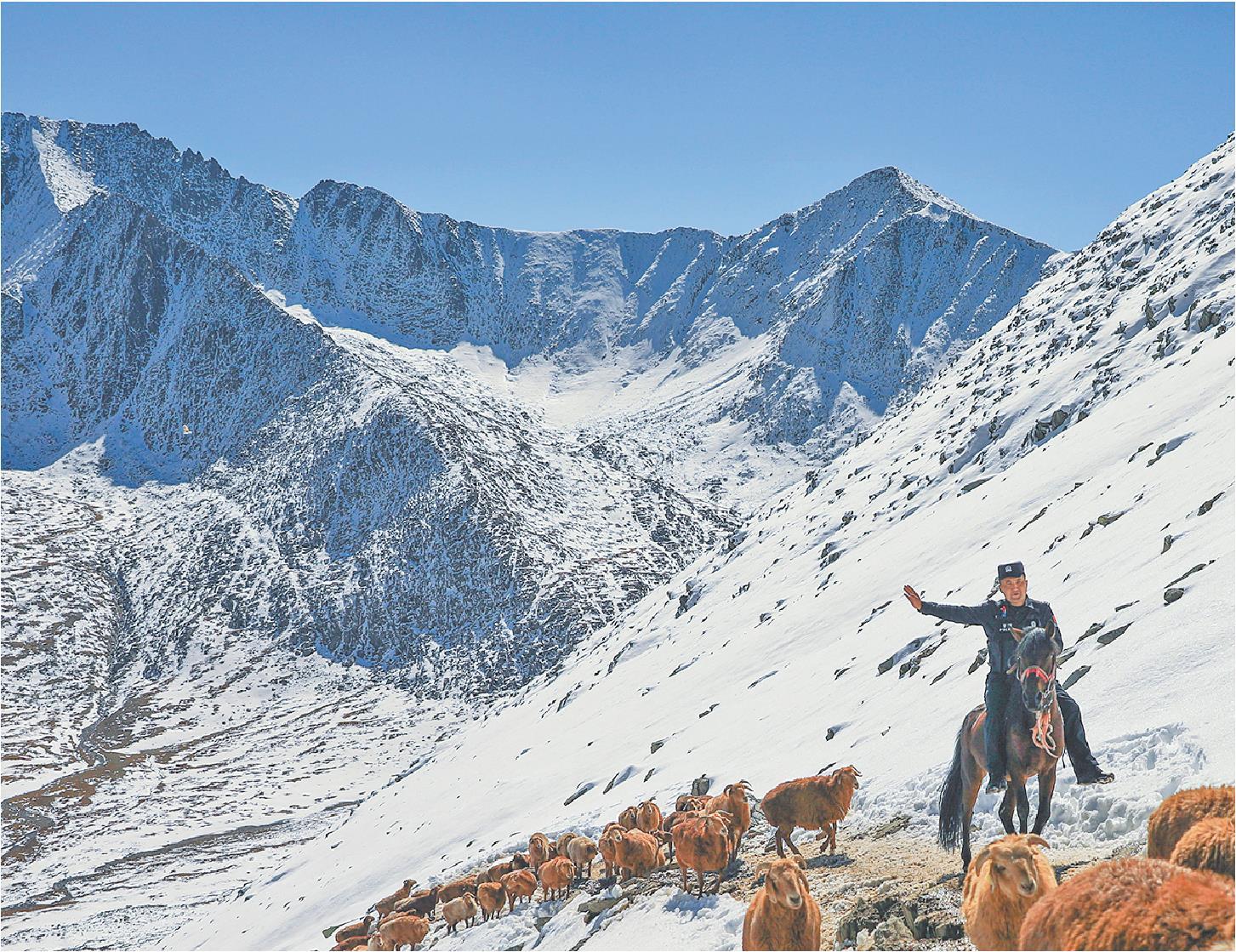 9月6日,库尔木图边境派出所民警叶尔兰别克·海吾热拉为穿越诺尔特山的牧民护航。
