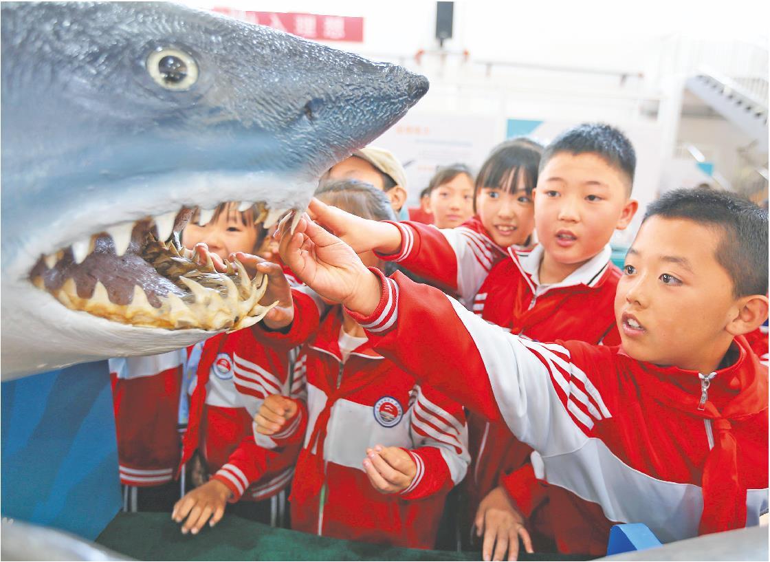 9月8日,在甘肃省定西市举办的“山海相依,筑梦蔚蓝”山东青岛·甘肃定西海洋科普东西部协作主题活动中,定西市安定区关川实验学校的学生在观看海洋生物标本。