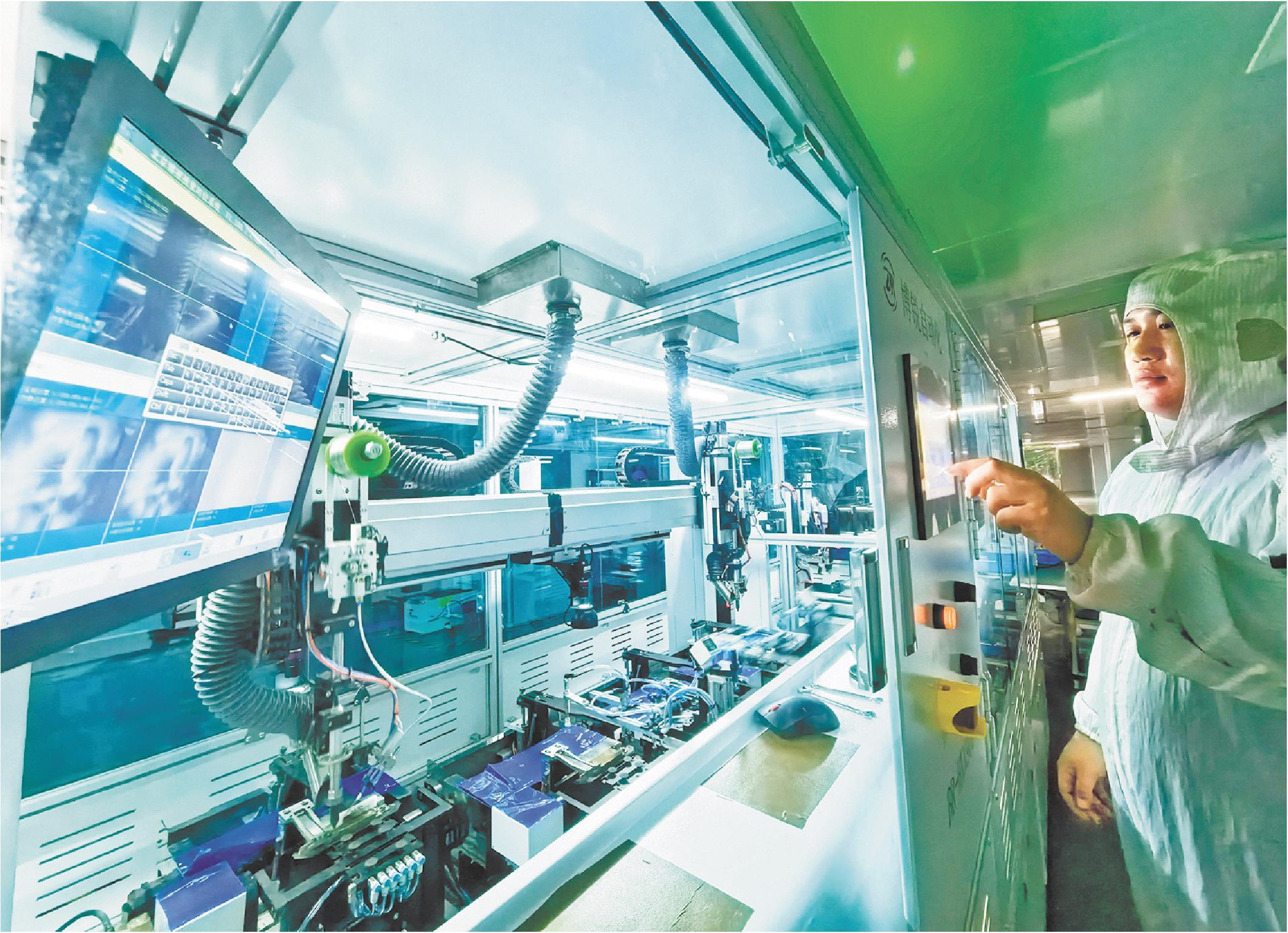 日前,山东多亿电子科技有限公司技术人员正在车间内察看手机显示屏全自动贴合线运行情况。