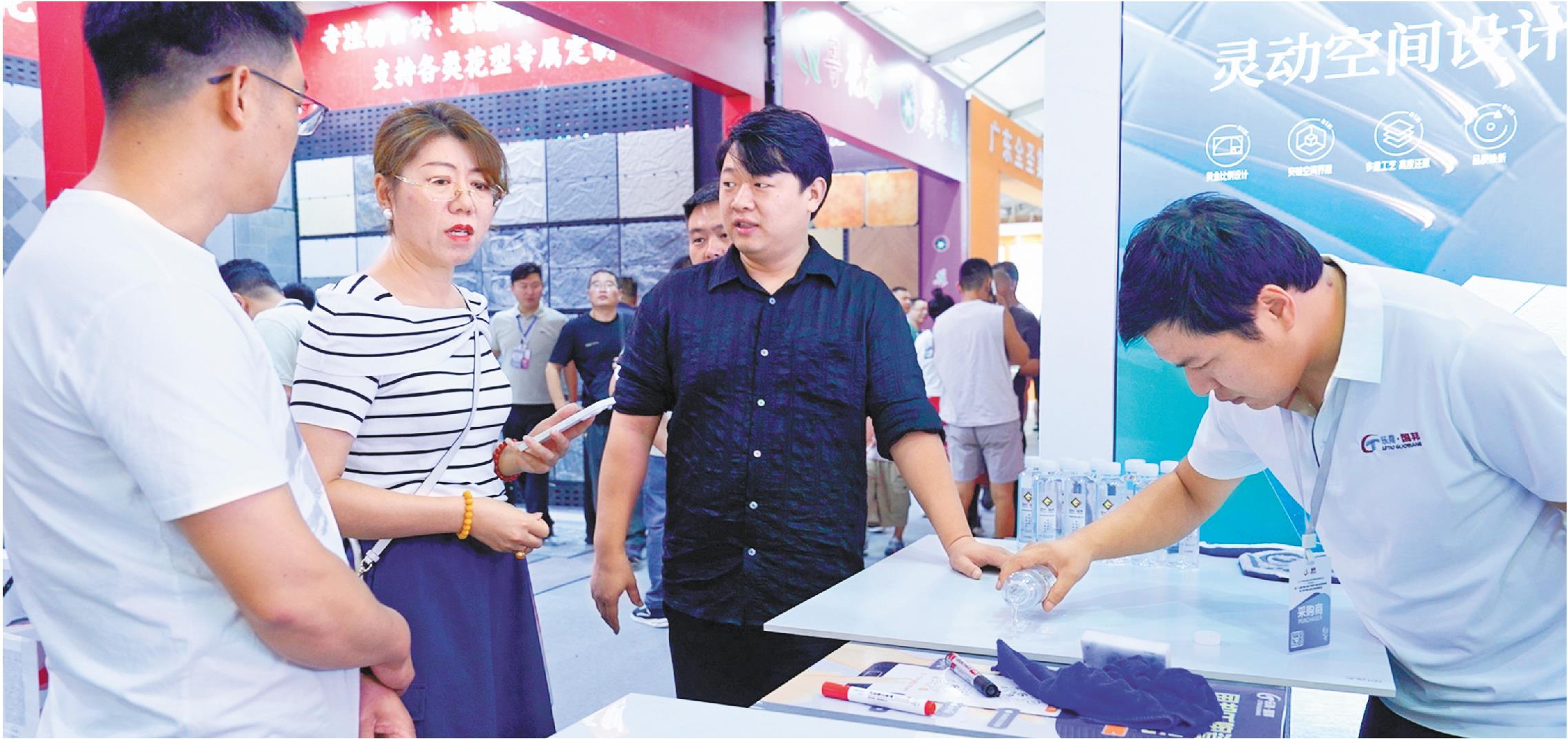 图中参展商正往瓷砖釉面倒水,为客户现场测试其防水性与致密性。