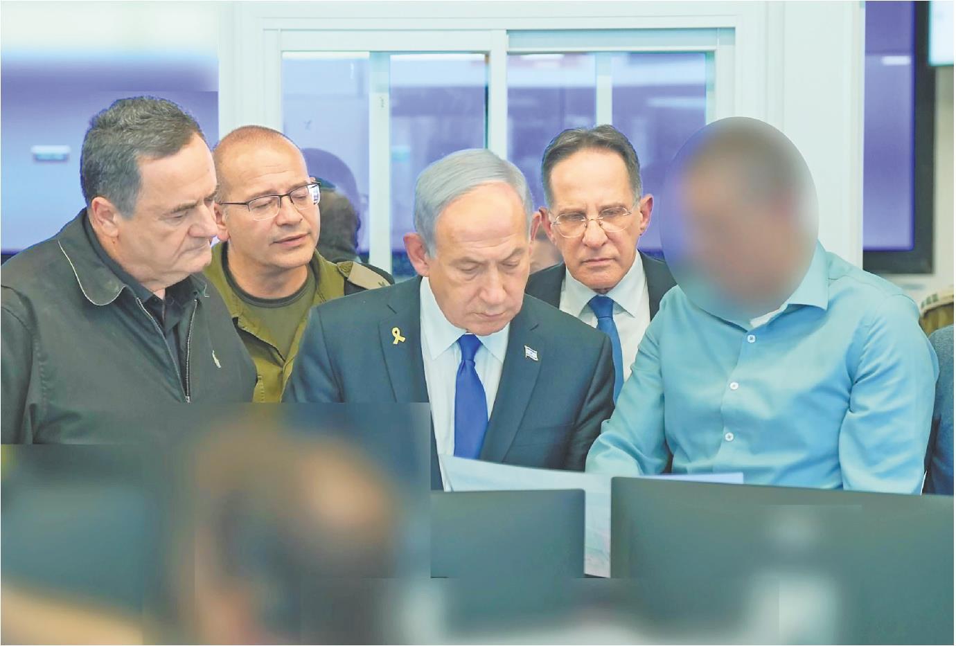 这张以色列国家安全总局(辛贝特)发布的照片显示,9月9日,以色列总理内塔尼亚胡(中)、以色列国防部长卡茨(左一)等在一处辛贝特指挥中心内交流。