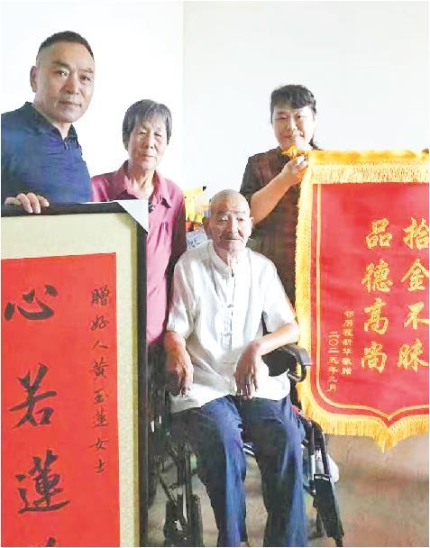 9月12日下午,泰安市粥店街道泰和家苑小区内,居民程新华(左一)夫妇手捧锦旗再次走进同小区黄玉莲(左二)老人家中。就在前不久,程新华把妻子为孩子准备的1.4万元保险费,当成废纸扔到楼下垃圾桶,75岁的黄玉莲捡到并归还(更多相关故事请见“开屏见好)。