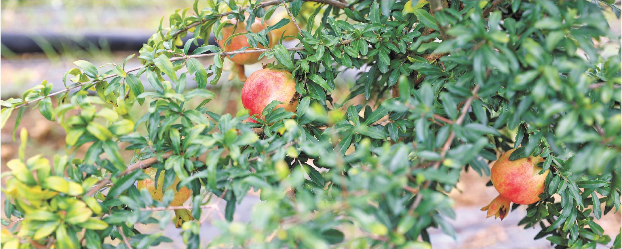 2021年6月17日到9月17日,枣庄市峄城区的石榴种子随神舟十二号飞船遨游太空,此后在北京林业大学入土培育、发芽成长。2023年,这批石榴幼苗回到峄城,落户枣庄市石榴国家林木种质资源库,500余株“太空石榴”苗茁壮成长。图为部分植株已开始结果。