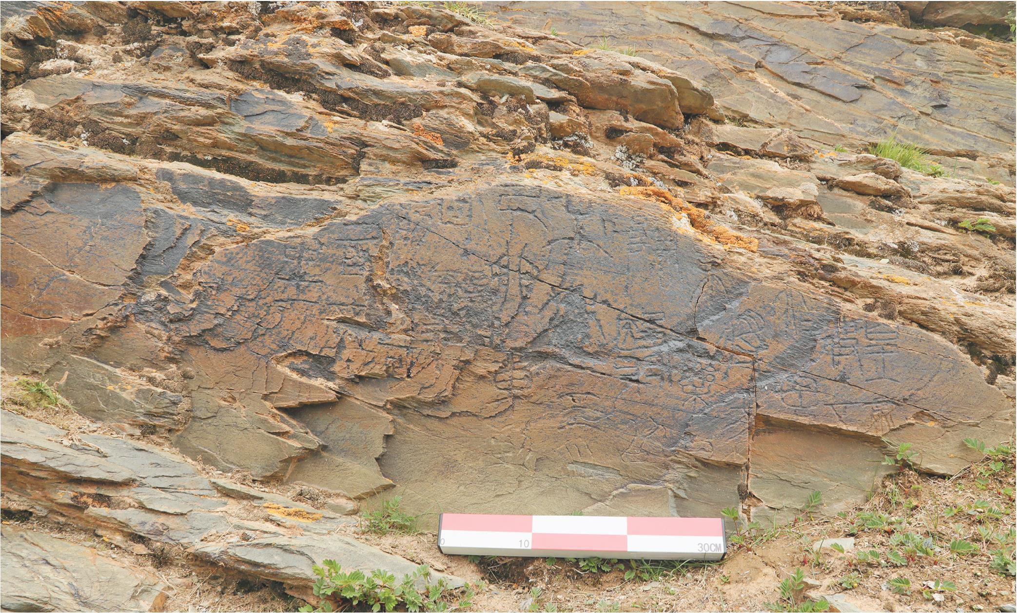 2023年7月,文物考古工作者在青海省果洛藏族自治州玛多县扎陵湖畔对“尕日塘秦刻石”进行现场考察时,拍摄的遗迹照片。