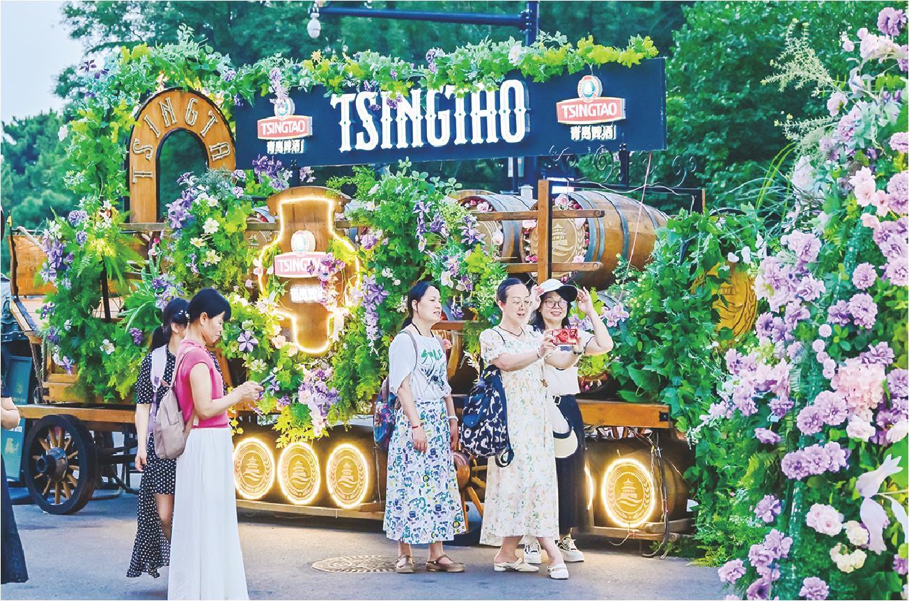 市民游客在青岛中山路壹号·青岛啤酒传奇club前打卡拍照