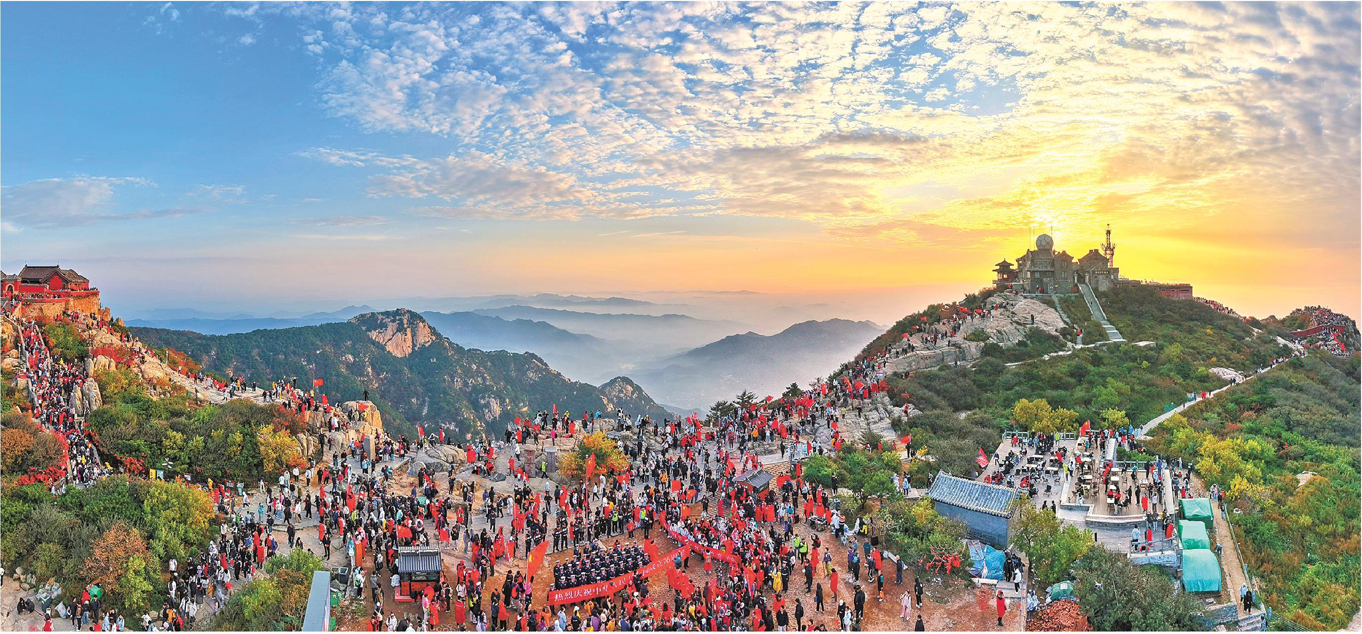 10月1日,1.3万名游客齐聚泰山之巅,祝愿伟大祖国繁荣昌盛、国泰民安。(□记者 刘涛 通讯员 陈阳 报道)