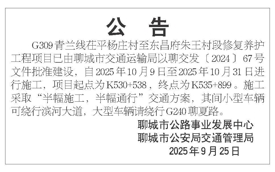 G309 青兰线茌平杨庄村至东昌府朱王村段修复养护工程项目已由聊城市交通运输局以聊交发〔2024〕67号文件批准建设,自2025年10月9日至2025年10月31日进行施工,项目起点为K530+ 538,终点为K535+ 899。施工采取“半幅施工,半幅通行”交通方案,其间小型车辆可绕行滨河大道,大型车辆请绕行G240 聊夏路。