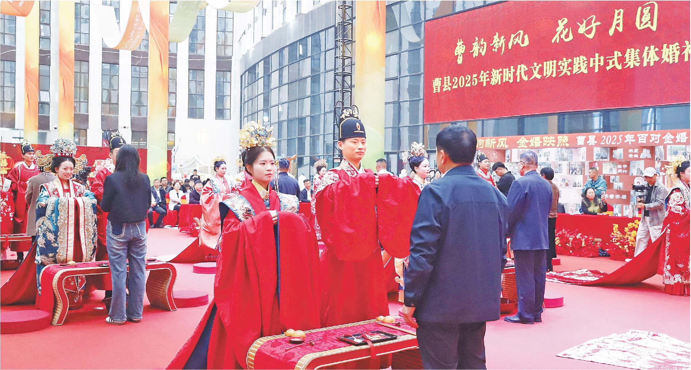 山东与河南地缘相近、人缘相亲,民间通婚历史悠久。为推动移风易俗工作,曹县与梁园区首次联合举办集体婚礼,引领两地精神文明建设新风尚。图为曹县集体婚礼现场,新人家长向新人传家训、致祝福。