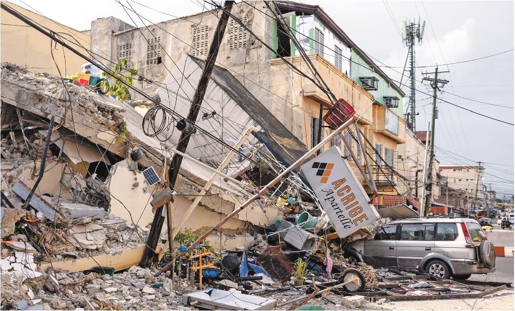 10月2日,在菲律宾宿务省博戈市拍摄的因地震受损的建筑和汽车。(□新华社发)