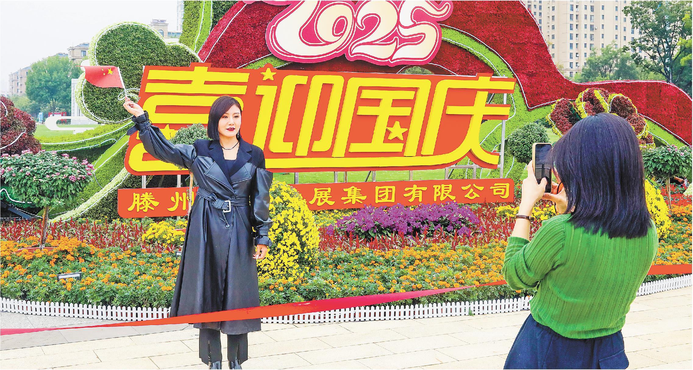 国庆期间,滕州在城区部分区域摆放各类时令花卉10万余株,营造欢乐、祥和、喜庆的节日氛围。滕州市民公园布置的花架,是此次节日景观打造的亮点之一,花架由3万余株时令花卉簇拥而成,以“礼赞新时代、奋进新征程”为核心主题,呈现出长20米、高6.5米的立体造型。图为市民在“喜迎国庆”主题景观前拍照。