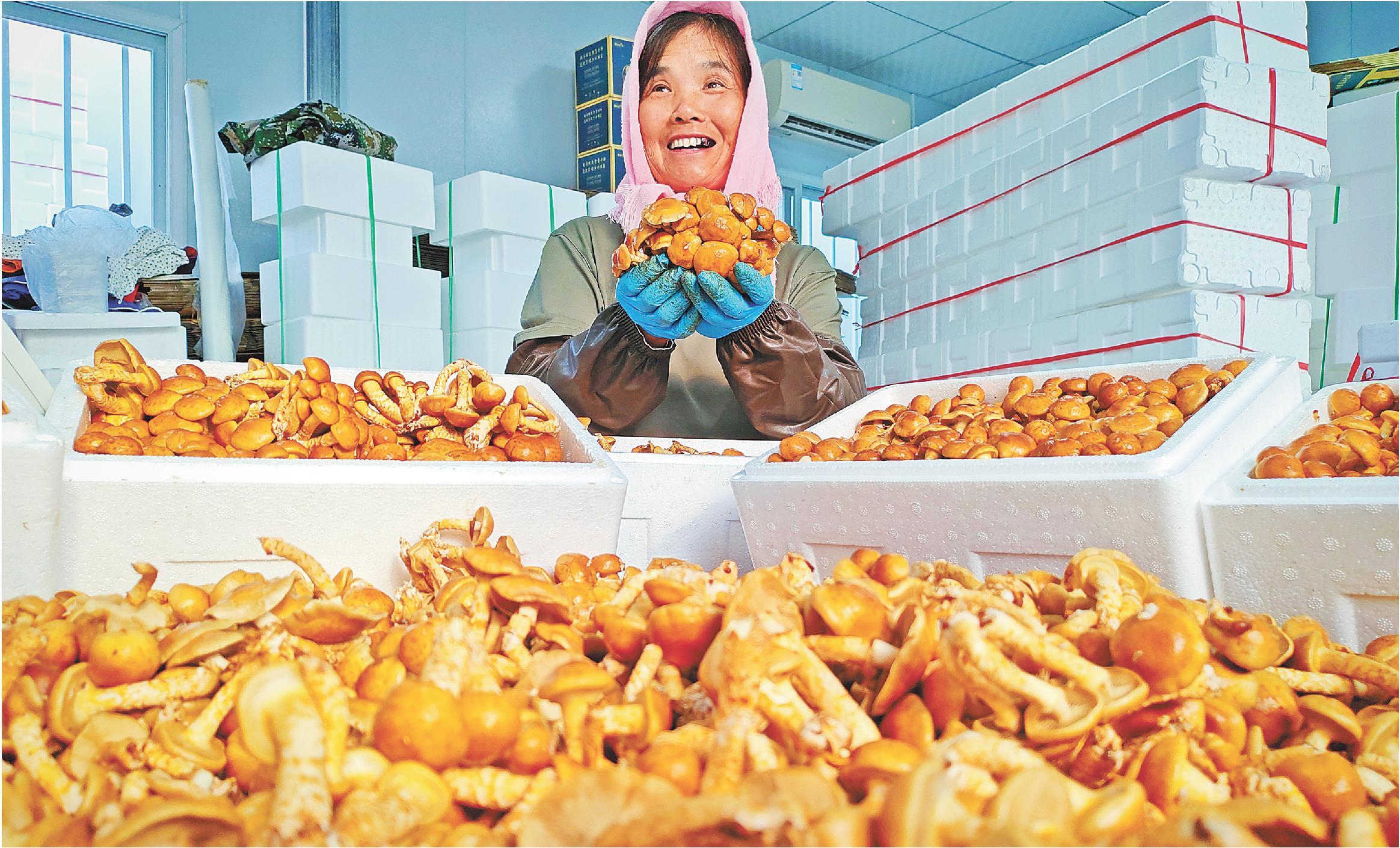 图为村民展示刚采摘的滑子菇。