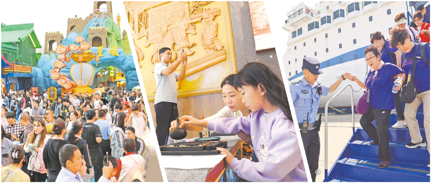 图①:“九曲黄河万里情”主题街区游人如织。 图②:京台高速曲阜服务区里,游客体验传统文化项目。 图③:韩国游客从石岛口岸入境,开启威海游。