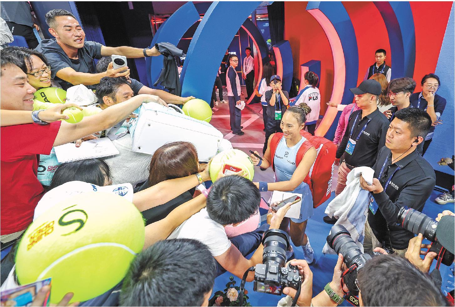 9月27日,在北京举行的2025中国网球公开赛女单第二轮与哥伦比亚选手阿朗戈的比赛后,中国选手郑钦文(中)与观众互动。(□新华社发)