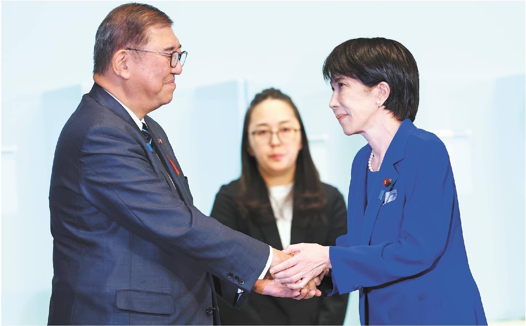 10月4日,在日本东京的自民党总部,高市早苗(右)在自民党总裁选举中胜出后向日本首相、自民党前任总裁石破茂(左)致意。(□新华社发)