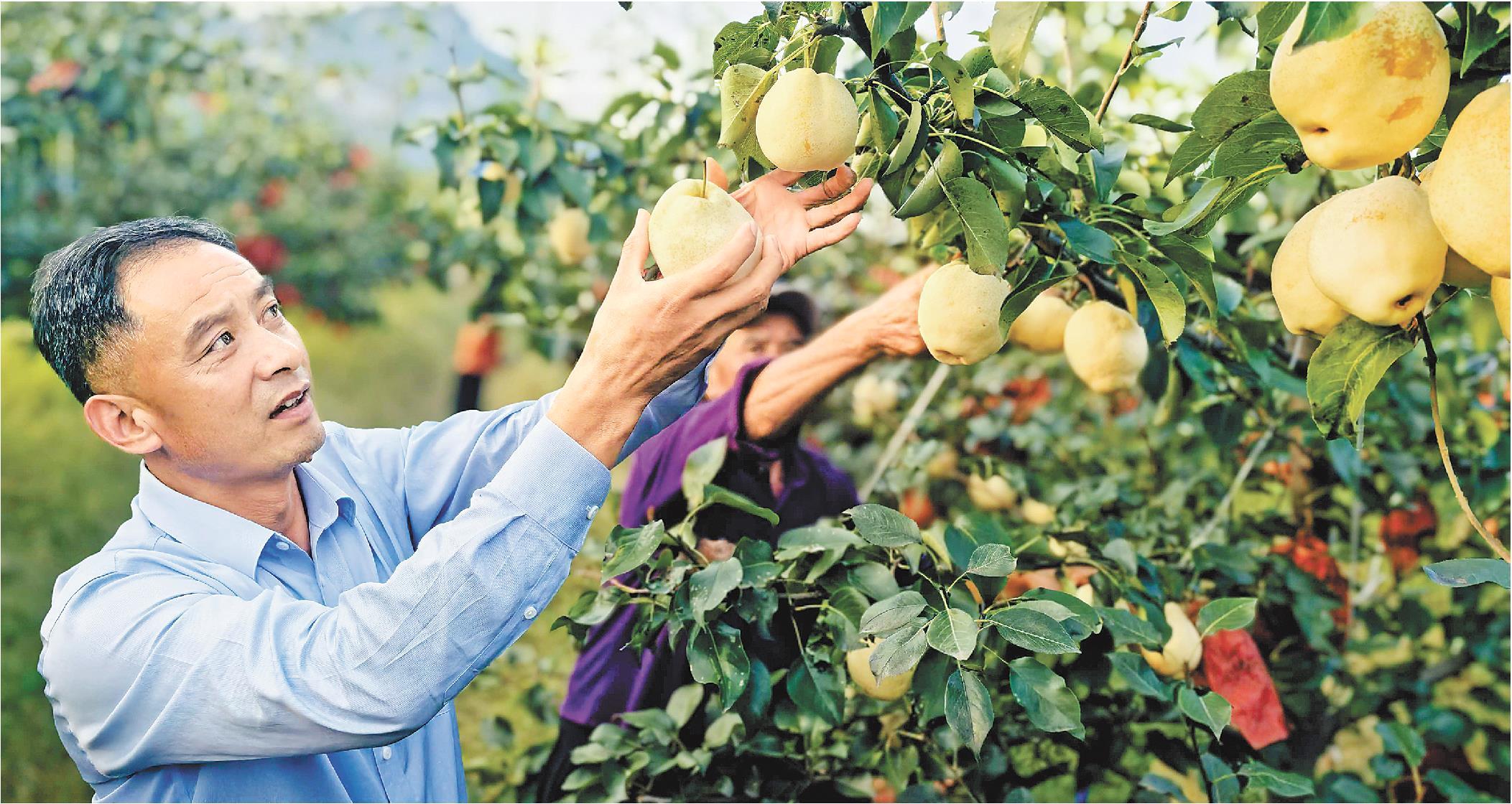 新泰市谷里镇北谷里村党总支书记、村委会主任毛志成和果农在采摘酥梨。