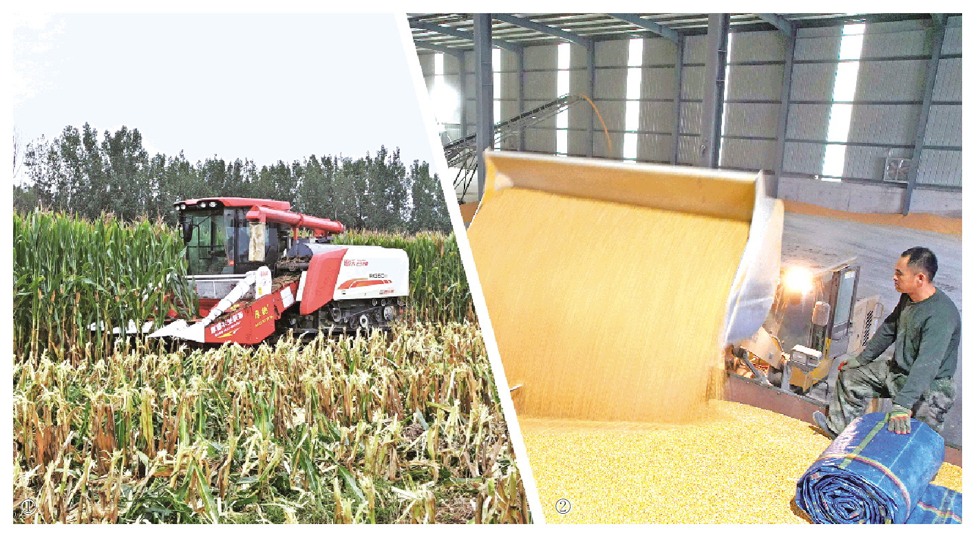 图①:10月9日,肥城市安驾庄镇朱家颜子村秋收现场。(□记者 李培乐 通讯员 董效晏 报道) 图②:10月9日,东营市东营区谭家大棚种植农民专业合作社里,工作人员对已经烘干的玉米进行装车收储。(□通讯员 缪宏伟 报道)