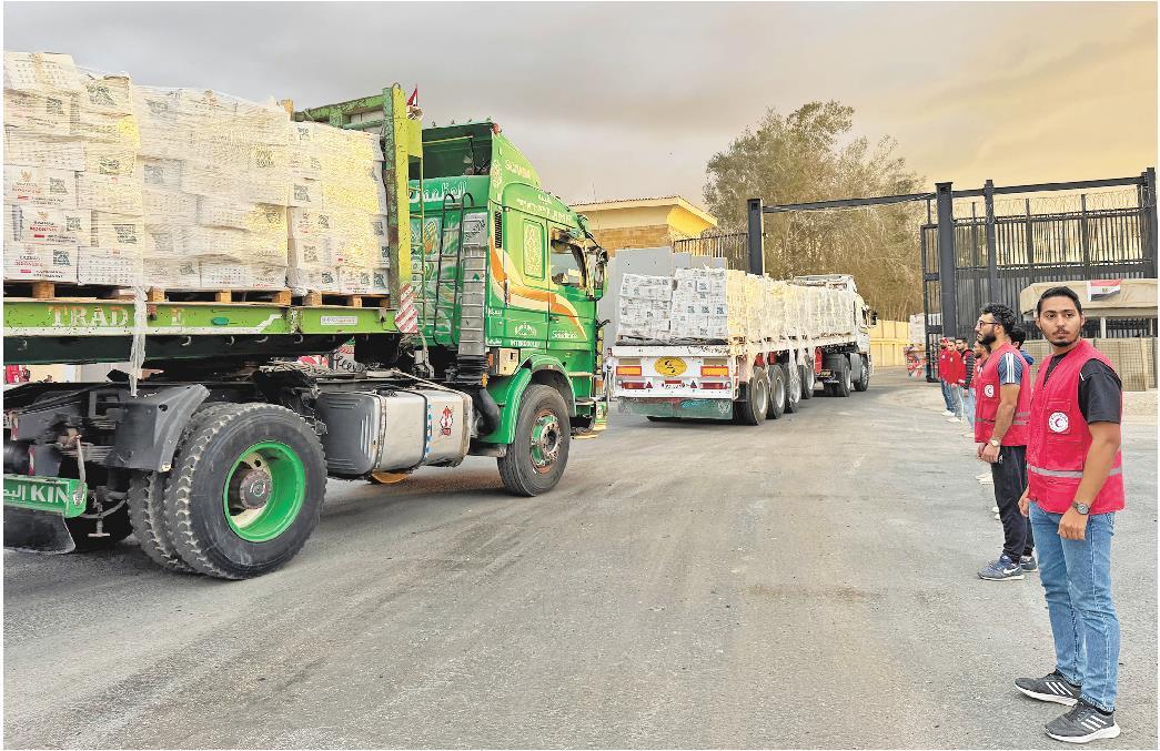 10月12日,载有人道主义援助物资的卡车在埃及红新月会工作人员的监督下从拉法口岸埃及一侧驶向加沙。(□新华社发)