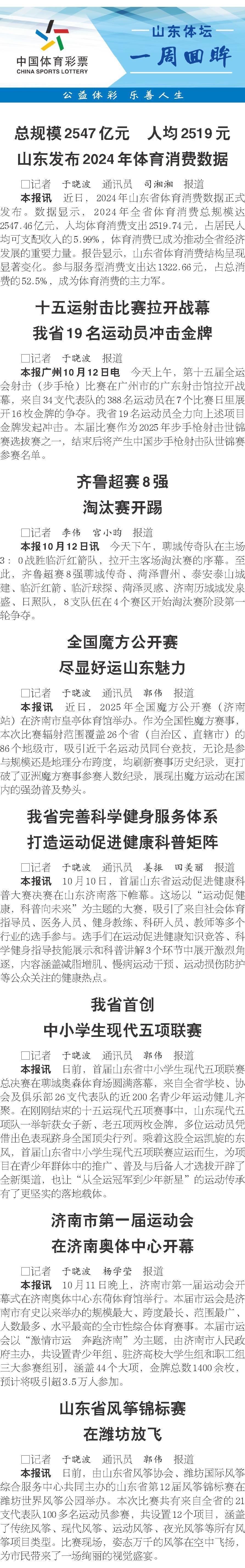 本报讯近日,2024年山东省体育消费数据正式发布。数据显示,2024年全省体育消费总规模达2547.46亿元,人均体育消费支出2519.74元,占居民人均可支配收入的5.99%,体育消费已成为推动全省经济发展的重要力量。报告显示,山东省体育消费结构呈现显著变化。参与服务型消费支出达1322.66元,占总消费的52.5%,成为体育消费的主力军。