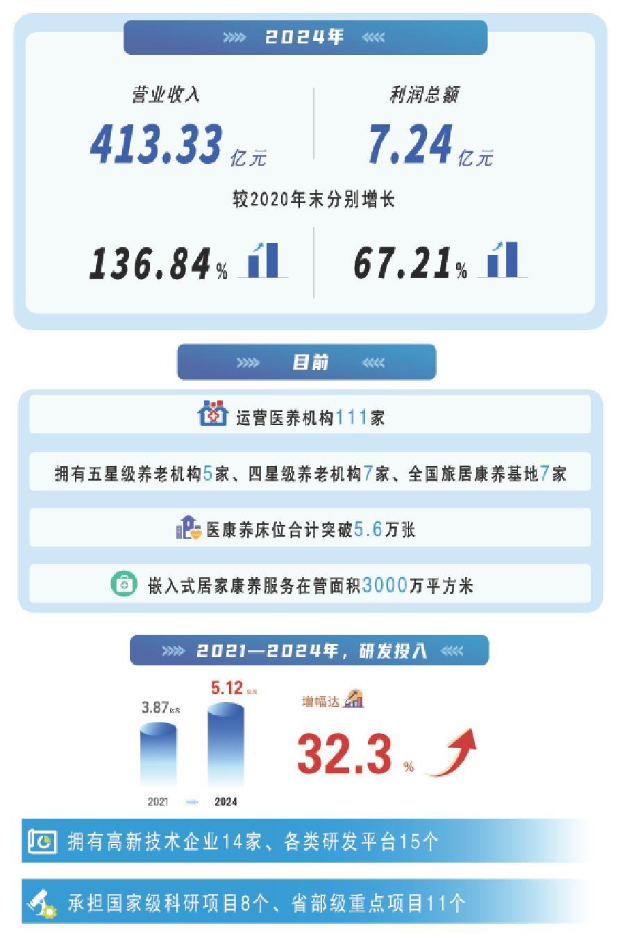 从扬帆起航到如今成为资产近千亿元的产业航母,“十四五”期间,山东健康用实干实绩书写了一份沉甸甸的答卷——资产总额近1000亿元,较成立之初增长34.80%;营业收入突破400亿元,实现136.84%的跨越式增长;利润总额提升67.21%,有效实现国有资产保值增值;获双AAA主体信用评级;运营医养机构111家,医康养床位突破5.6万张,规模居省级医养企业第一位、国内医养企业前列;嵌入式居家康养服务在管面积3000万平方米,位居中国康养企业500强第2位,入选全省医养健康特色产业集群、全省“十强产业”集群领军企业、山东百强企业……重整行装再出发,山东健康将在“十四五”取得成绩的基础上,提振信心、团结共进,以更加优异成绩为现代化强省建设作出新的更大贡献。