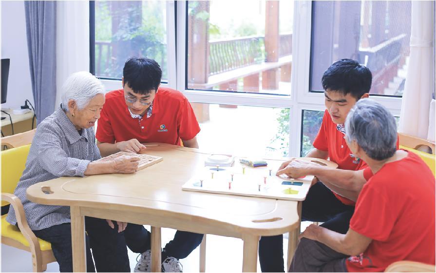 山东健康“益寿光年”逸乐医养中心照护人员为入住长者进行康复训练