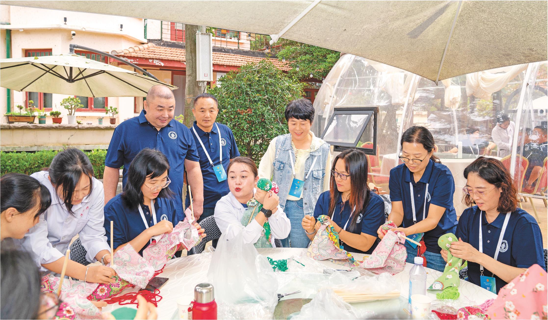 图为职工代表在青岛湛山疗养院中医疗休养基地学习制作养生锤。