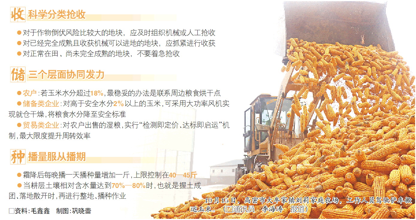 据预报,预计10月18日起全省将会进入降水间歇期,气象条件对土壤散墒较为有利。“建议大家抓住天气晴好窗口期,统筹考虑种植面积以及作物成熟度、农机适配度、晾晒匹配度等因素,对秋粮作物进行精准分类、适时收获。”彭科研说。