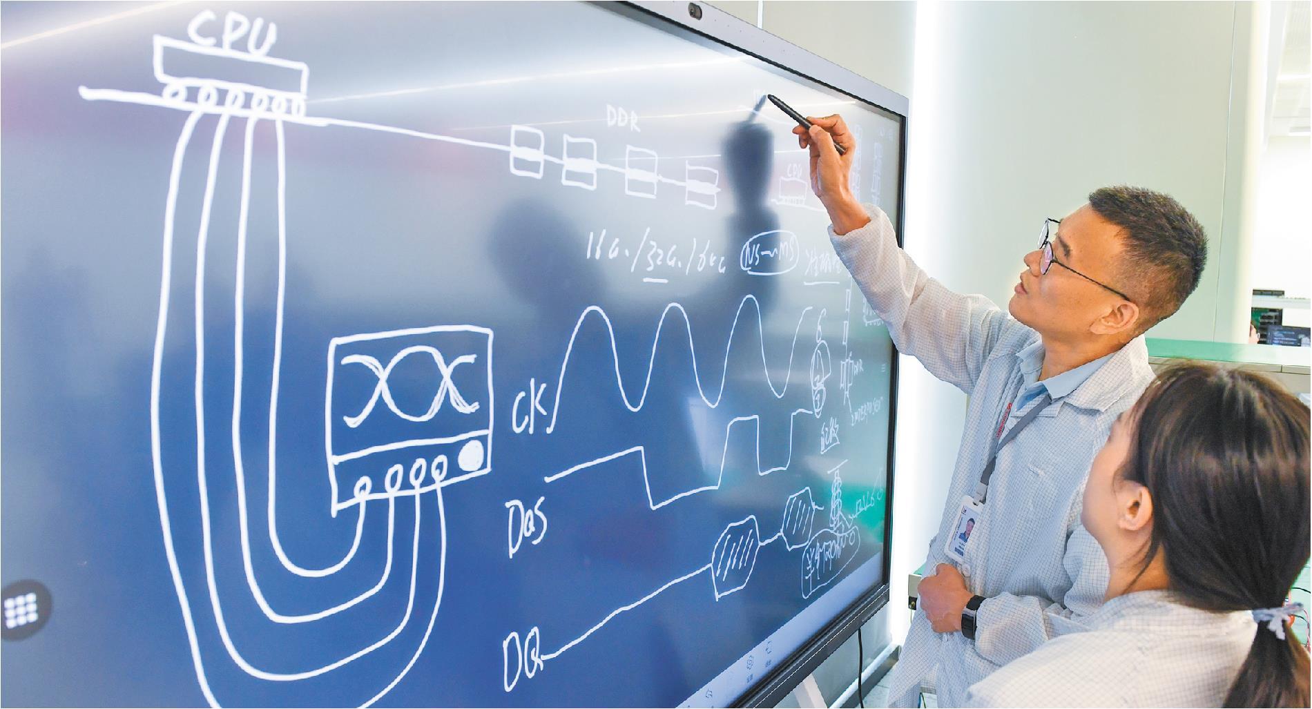 10月13日,在深圳市万里眼技术有限公司,实验室人员分析高速信号时序关系。