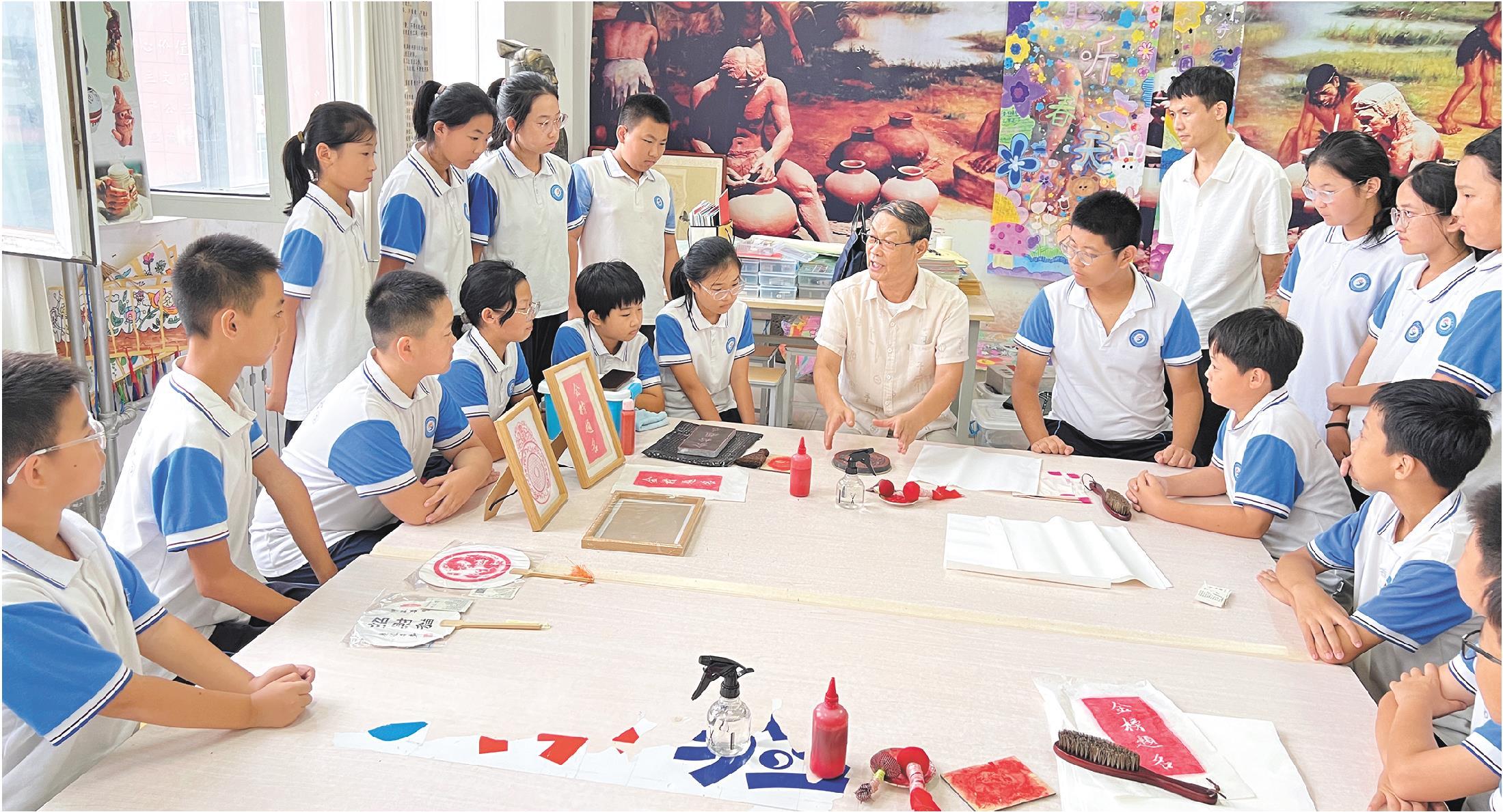 近日,在潍坊市昌乐一中英才实验学校的非遗教室里,非遗传拓技艺代表性传承人肖广德指导学生创作传拓作品。