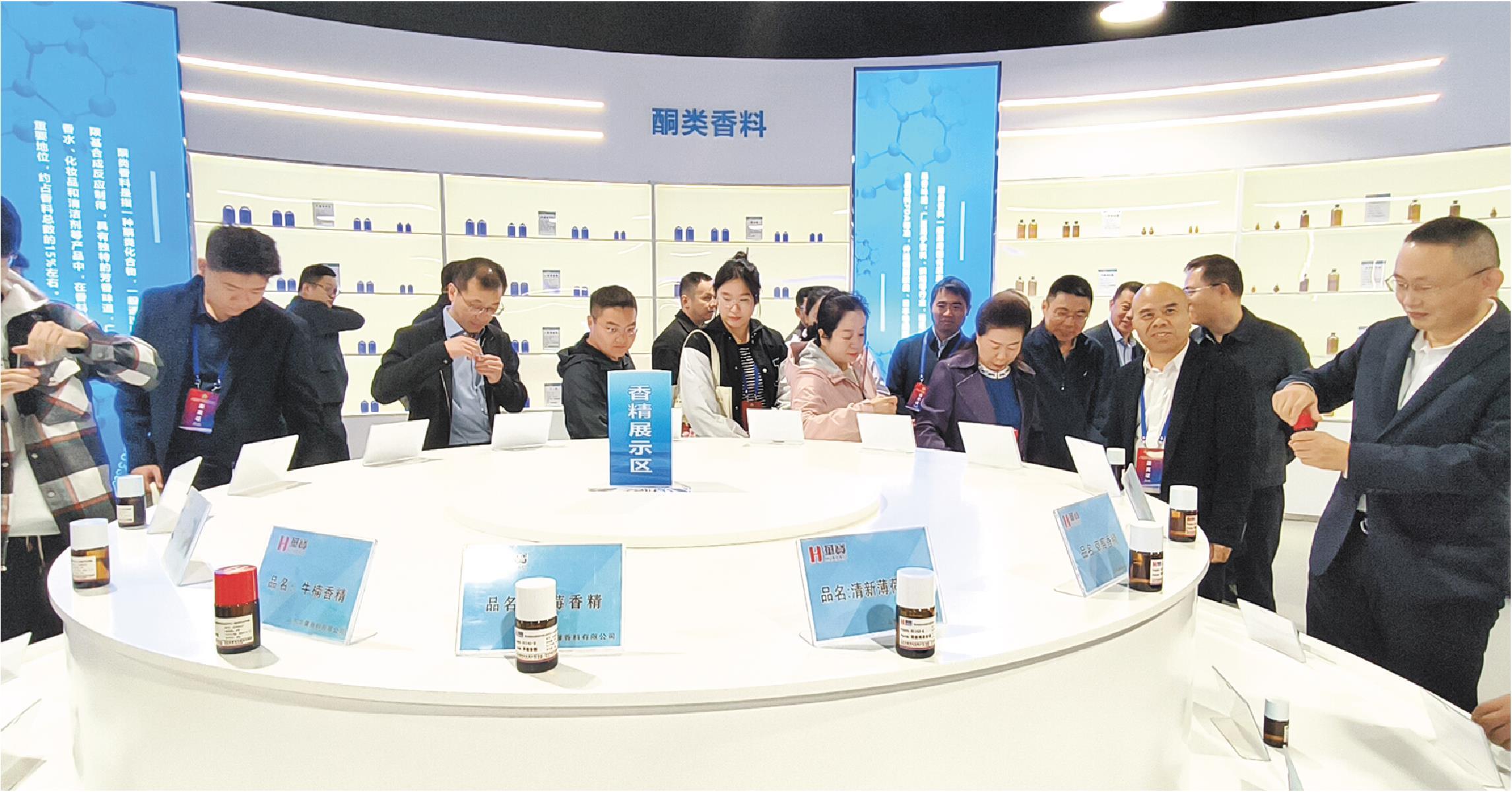 10月9日,“鲁商回家乡”优强企业菏泽(巨野)行启动大会在巨野举行。活动期间,鲁商代表深入巨野县化工、生物医药、新一代信息技术等特色产业一线展开调研。图为山东华馨香料有限公司系列产品吸引众人驻足观看。