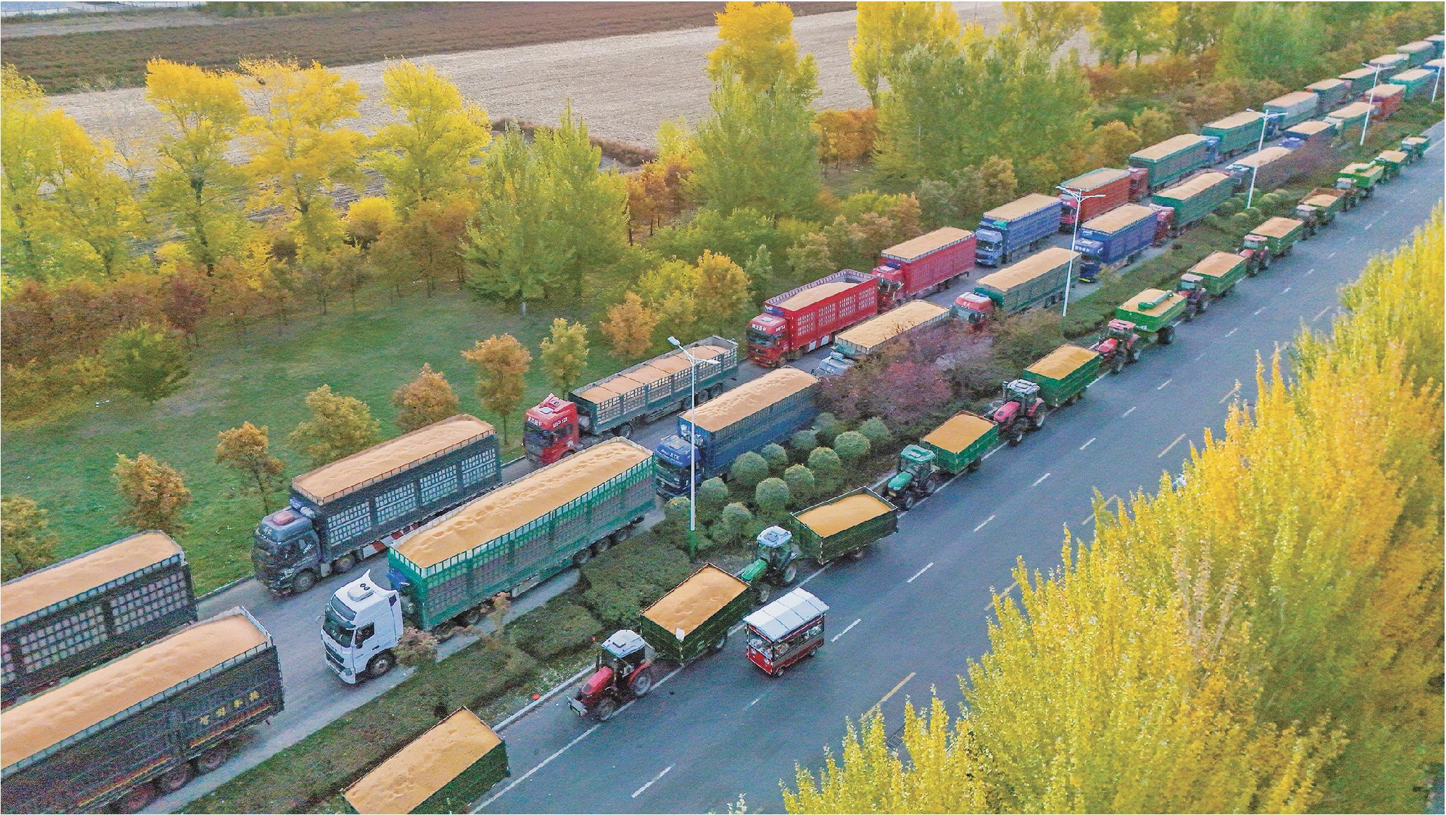 10月15日,卖粮车在黑龙江省佳木斯市富锦市一粮食收储企业门前排队。
