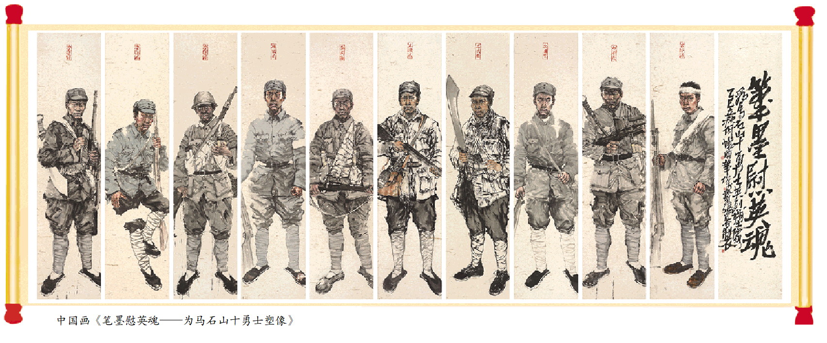 中国画《笔墨慰英魂—为马石山十勇士塑像》