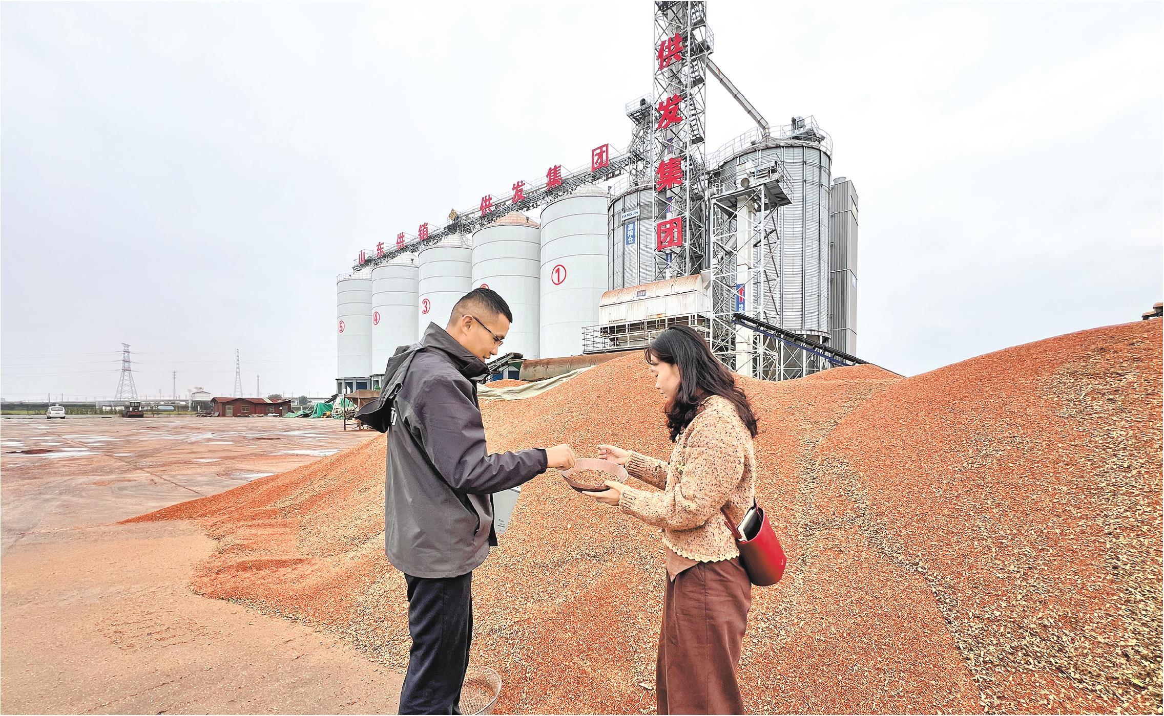 10月13日,在山东鲁供农场有限公司烘干基地里,工作人员向记者王思晴(右)介绍如何测量高粱的含水量。测完后,这100余吨高粱被送进烘干塔。