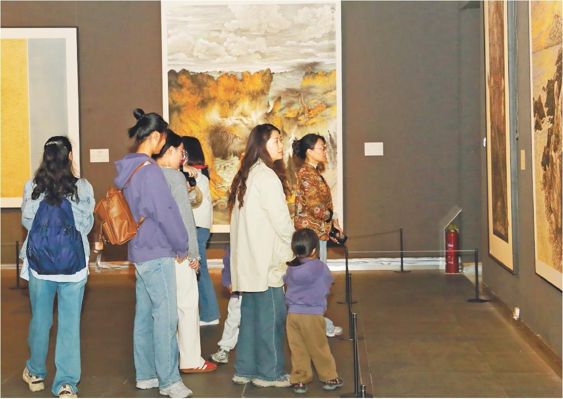 10月17日,市民在山东美术馆观展。当日,“深入生活 扎根人民”艺术创作成果展在山东美术馆开幕。展览以“大地的回声”为主题,集中展示山东文艺工作者2023年以来“深扎”行动中创作的340余组(件)作品,这些作品立足人民生活,弘扬沂蒙精神,描绘时代变迁,以多元艺术语言传递文艺与时代同频共振的力量。展览将持续至11月2号。