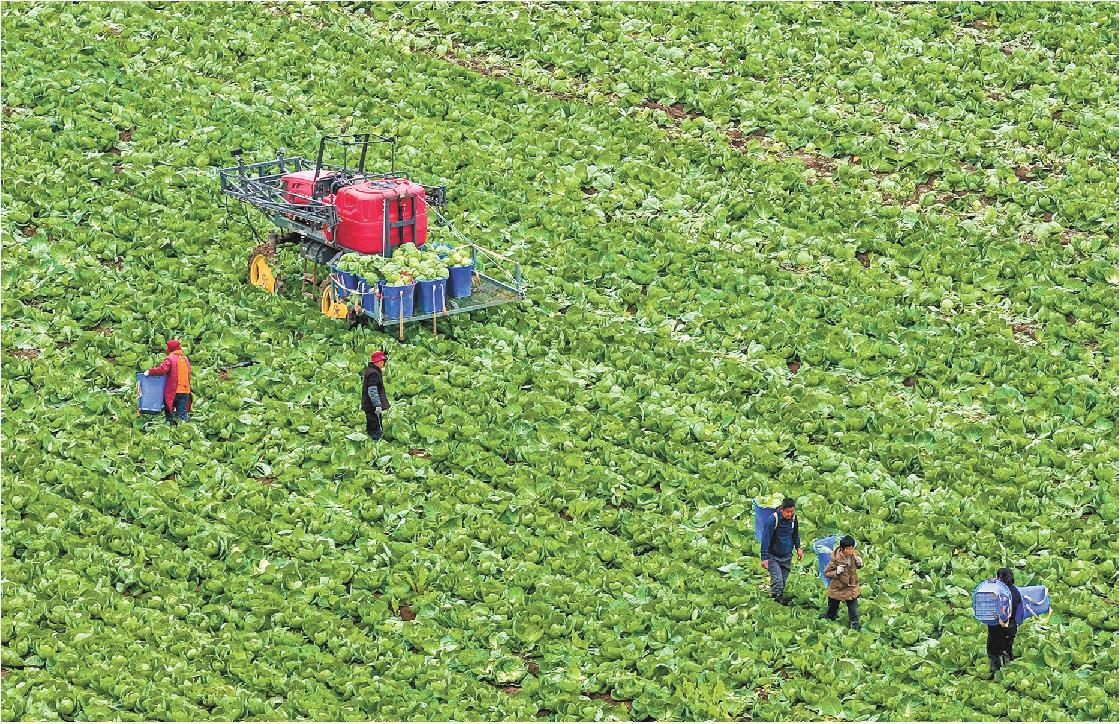 10月19日,聊城市茌平区振兴街道大崔村蔬菜种植基地,农民在采收甘蓝。该基地共种植600亩甘蓝,采摘后将送至北京、济南等地。近期我省迎来大风降温天气,农民加紧采收蔬菜,保障“菜篮子”稳定。