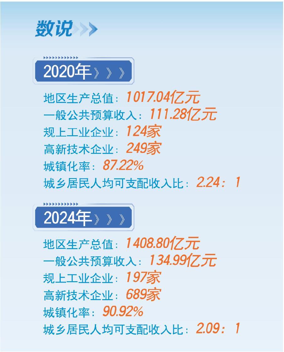 经济实力的跃升不止于总量。一般公共预算收入从2020年111.28亿元增至2024年134.99亿元,重点领域支出保障有力;常住人口从111.2万人增至114.23万人,城镇化率从87.22%升至90.92%,城市集聚效应持续释放。
