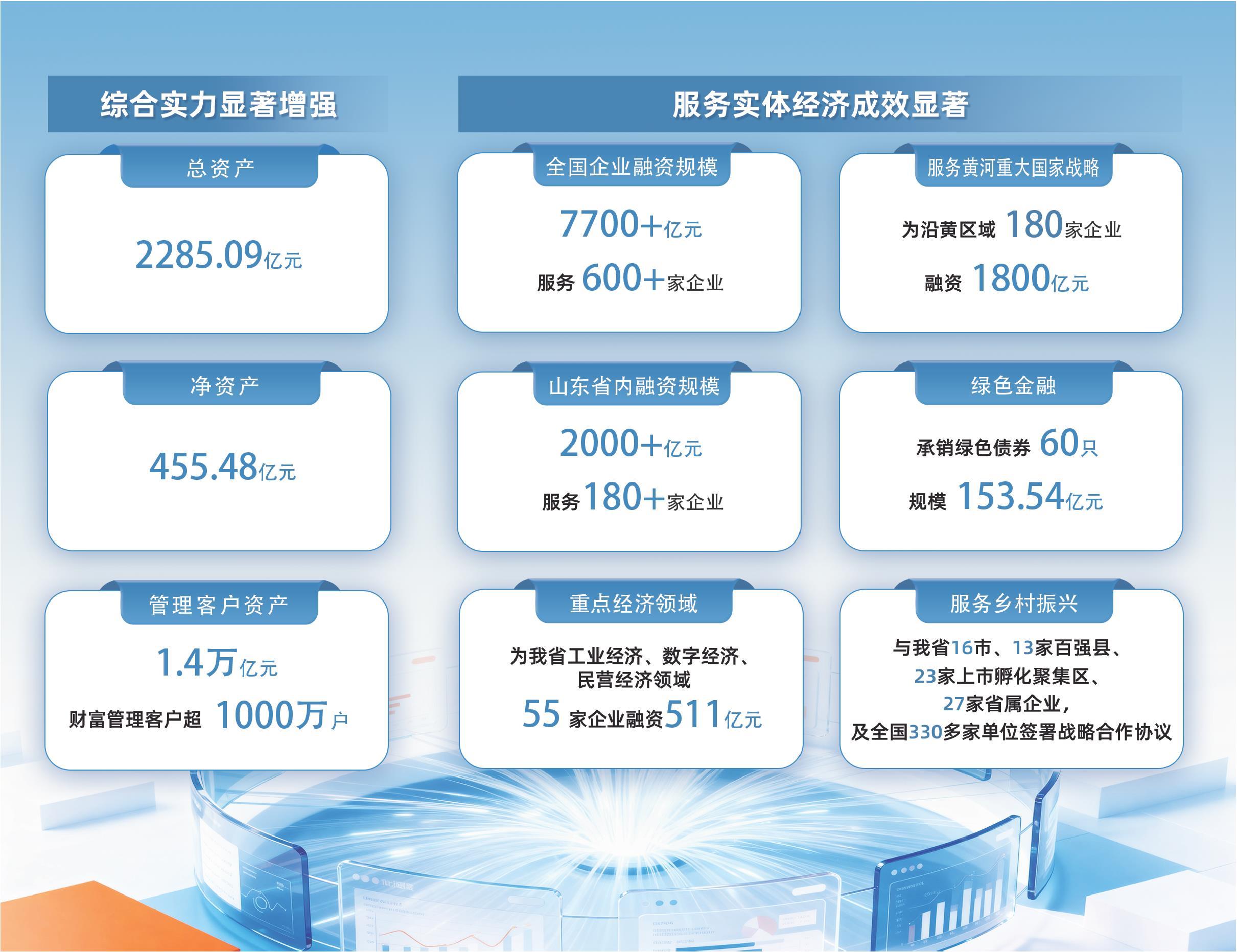 “十四五”的五年,是中国经济在高质量发展航道上前行的关键时期,也是金融业回归本源、重塑格局的深刻变革期。作为山东省属骨干券商,中泰证券聚焦高质量发展首要任务,建设忠诚、合规、创新、美美与共的一流证券公司,奋力扛起山东证券业旗帜,在服务国家和我省重大战略与经济社会发展的征程中,交出了一份沉甸甸的答卷。截至2025年上半年,中泰证券服务客户突破1000万户,管理客户资产超1.4万亿元,为全国600余家企业股债融资7700多亿元,为我省180家企业股债融资2000多亿元。