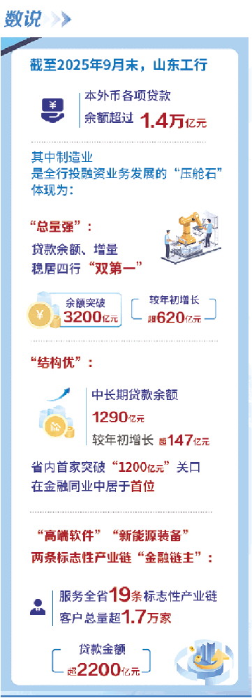 截至2025年9月末,山东工行是省内首家制造业贷款余额突破3200亿元、制造业中长期贷款突破1200亿元的国有大型商业银行,制造业贷款、中长期贷款余额和增量实现同业“四个第一”。