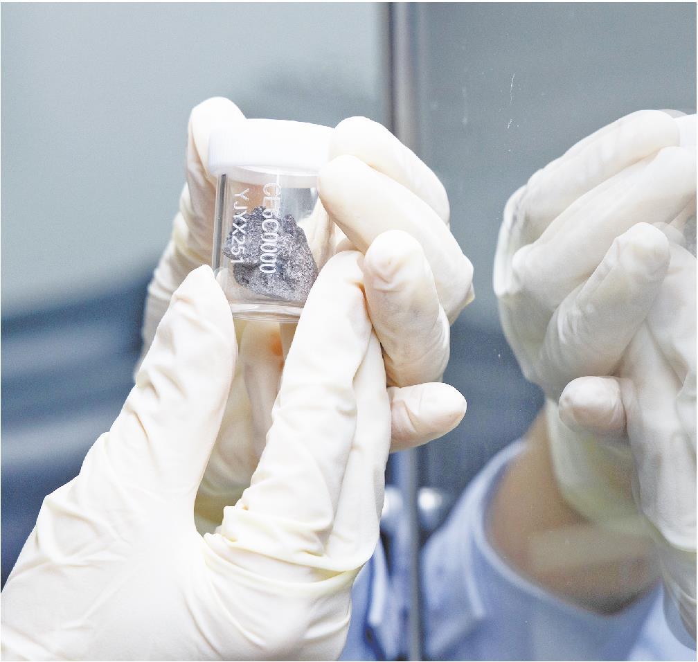 9月24日,科研人员在月球样品实验室展示嫦娥六号月球样品。