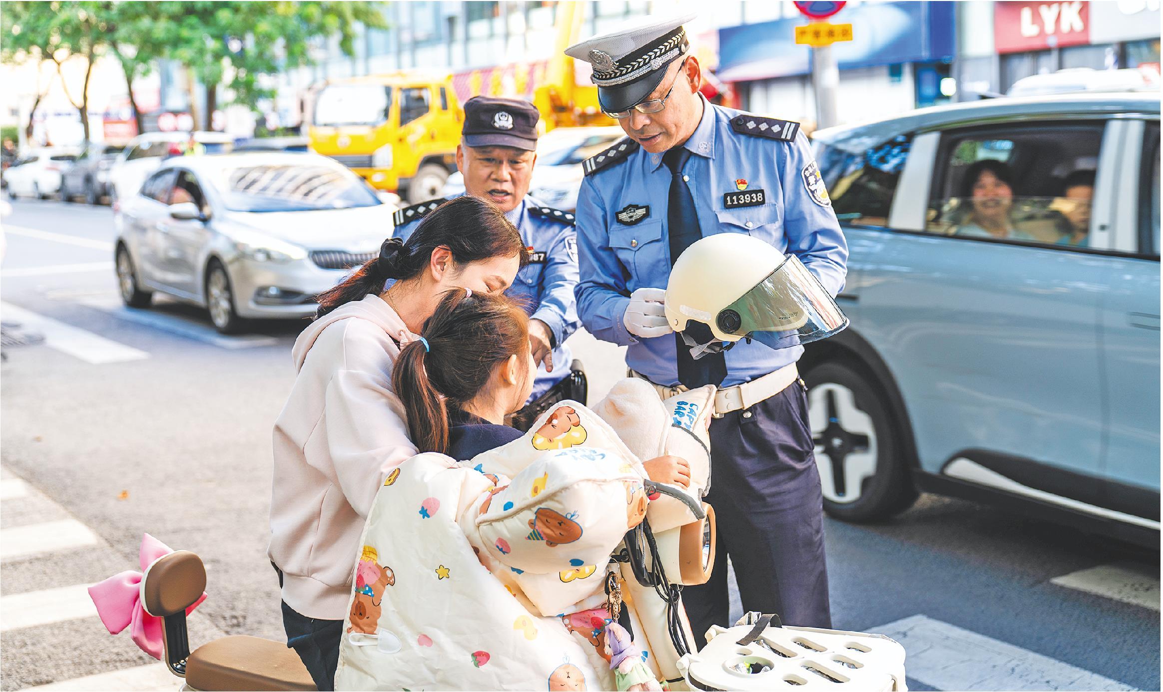 交警牛宏才(右一)和社区民警黄锋联勤联动,实现交通疏导与治安巡防同频共振。