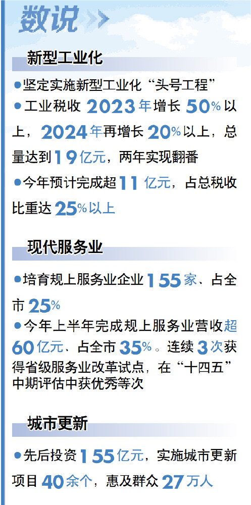坚持既抓招商引资更抓本土培育,“四项工程”成效更加明显。将培育壮大本土企业作为推进转型发展的重大举措,累计获评国家级单项冠军、“小巨人”17家,省级“专精特新”企业89家。实施搬家工程,鼓励引导10余家企业“出城入园”、扩产增效,腾退盘活土地2100余亩,今年全区规上工业企业营收、利润增长面达70%、75%。实施孵化工程,创新“国企+园区”模式,建成4个中小企业孵化园,2021年以来新增纳统工业企业88家,占全部规上工业企业比重超50%。实施重生工程,纾困帮扶企业16家,盘活资产50亿元。实施招大引强工程,聚焦输变电、商业航天、纺织服装等重点产业,成功引进国星宇航、东方空间、海富电子等20余家领军企业,其中,数据标注头部企业菲利信投资4亿元的数字经济产业基地,从签约到投产仅用45天。商用车座椅制造领军企业光华荣昌投资10亿元的汽车零部件项目当月洽谈、当月实现签约。纺织服装、输变电产业规模将分别突破70亿元、100亿元。